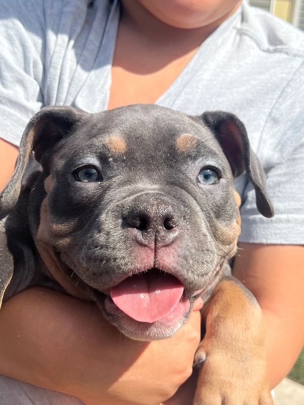 female mini micro bully with papers. White,brown grey, and black coat with beautiful blue eyes selling for $2000